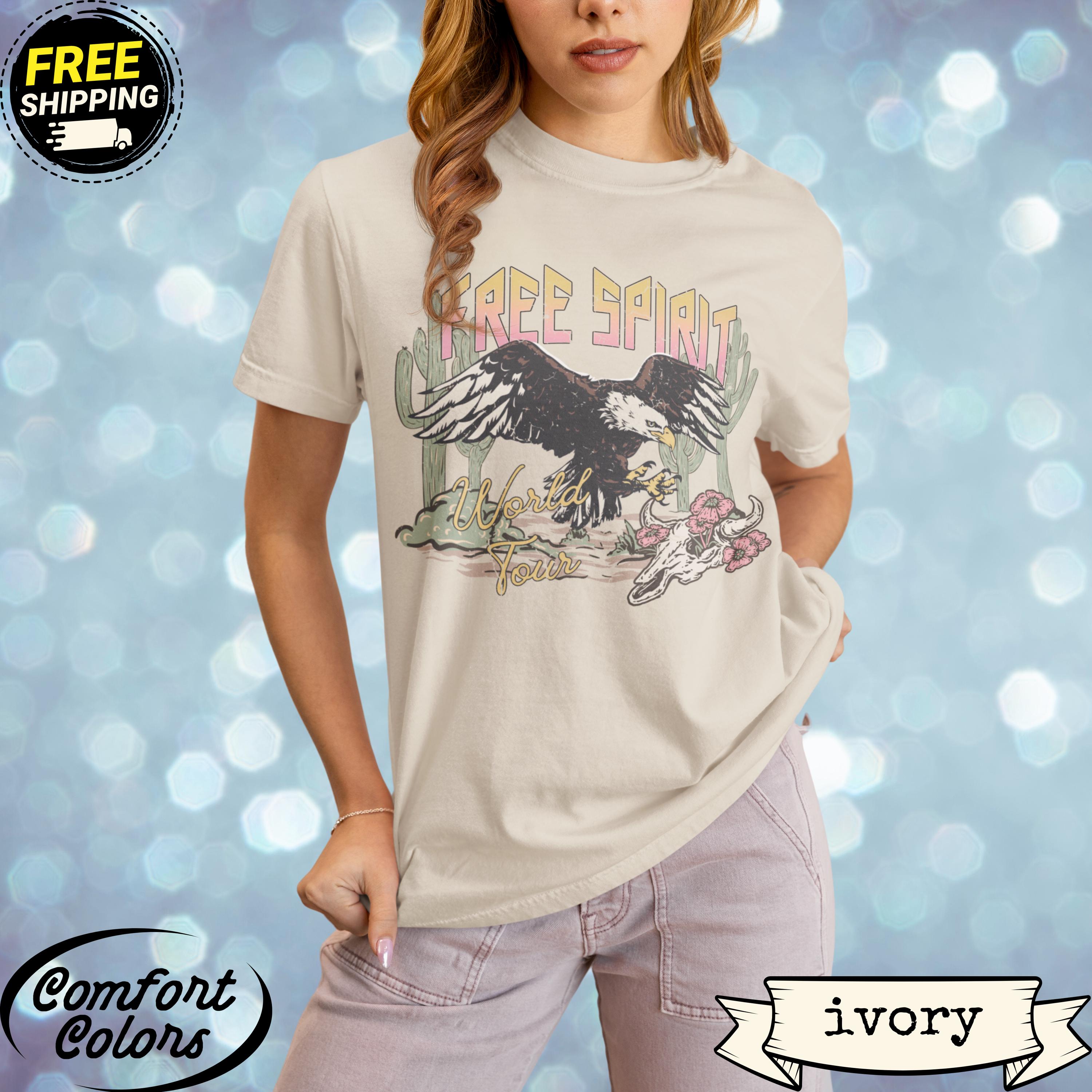 Channel your inner wild soul with this Free Spirit World Tour tee, featuring a bold eagle, desert cactus, and retro band tee vibes.