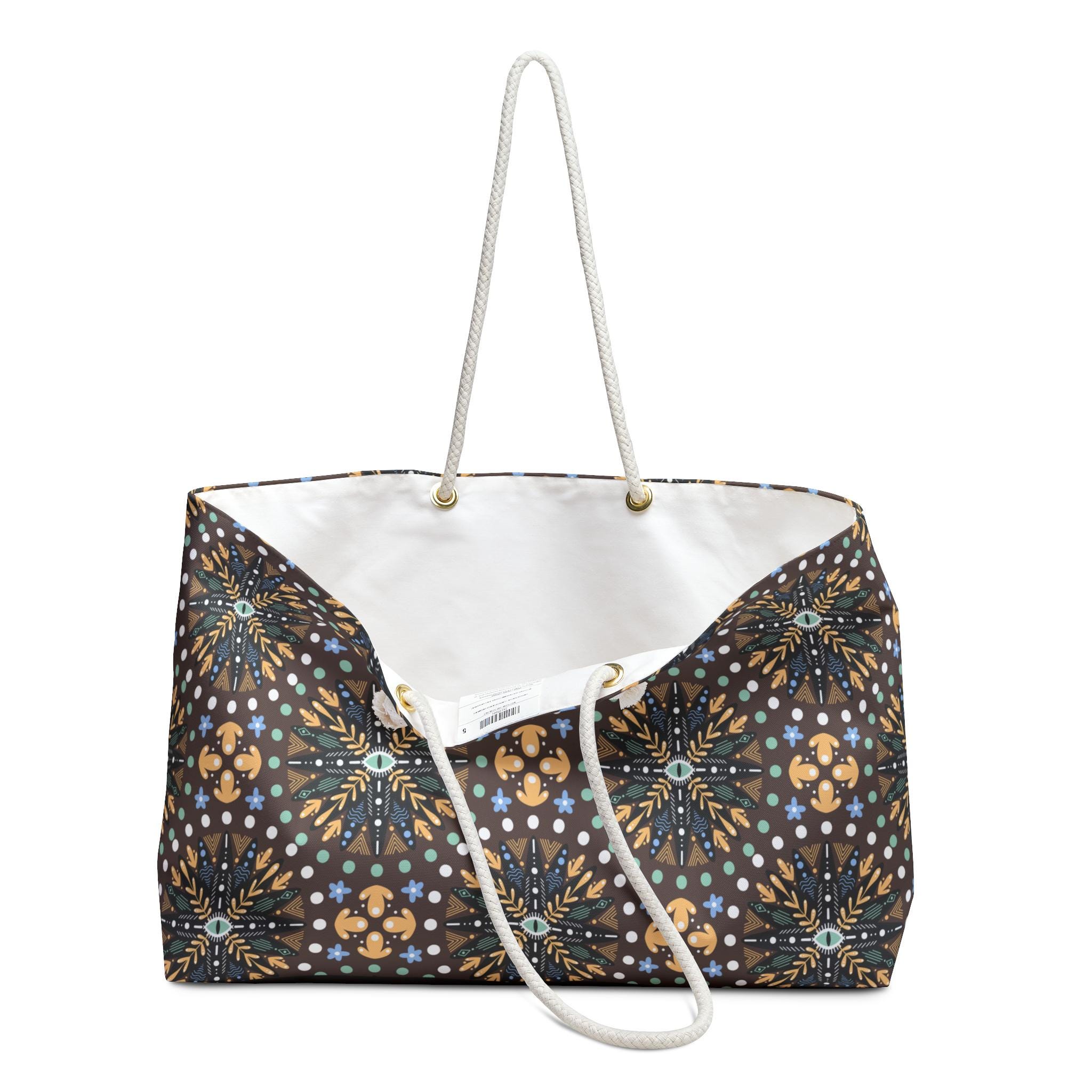 This boho mandala tote bag features an intricate tribal pattern in earthy tones, perfect for free spirits and hippie style lovers. Use it as a weekender tote, overnight carryall, or summer getaway travel bag that doubles as a stylish storage tote. Its bold geometric design makes it ideal for festivals, beach trips, and everyday errands. A versatile accessory and thoughtful gift for mom or travelers, this boho tote blends function and fashion with a unique artistic flair.