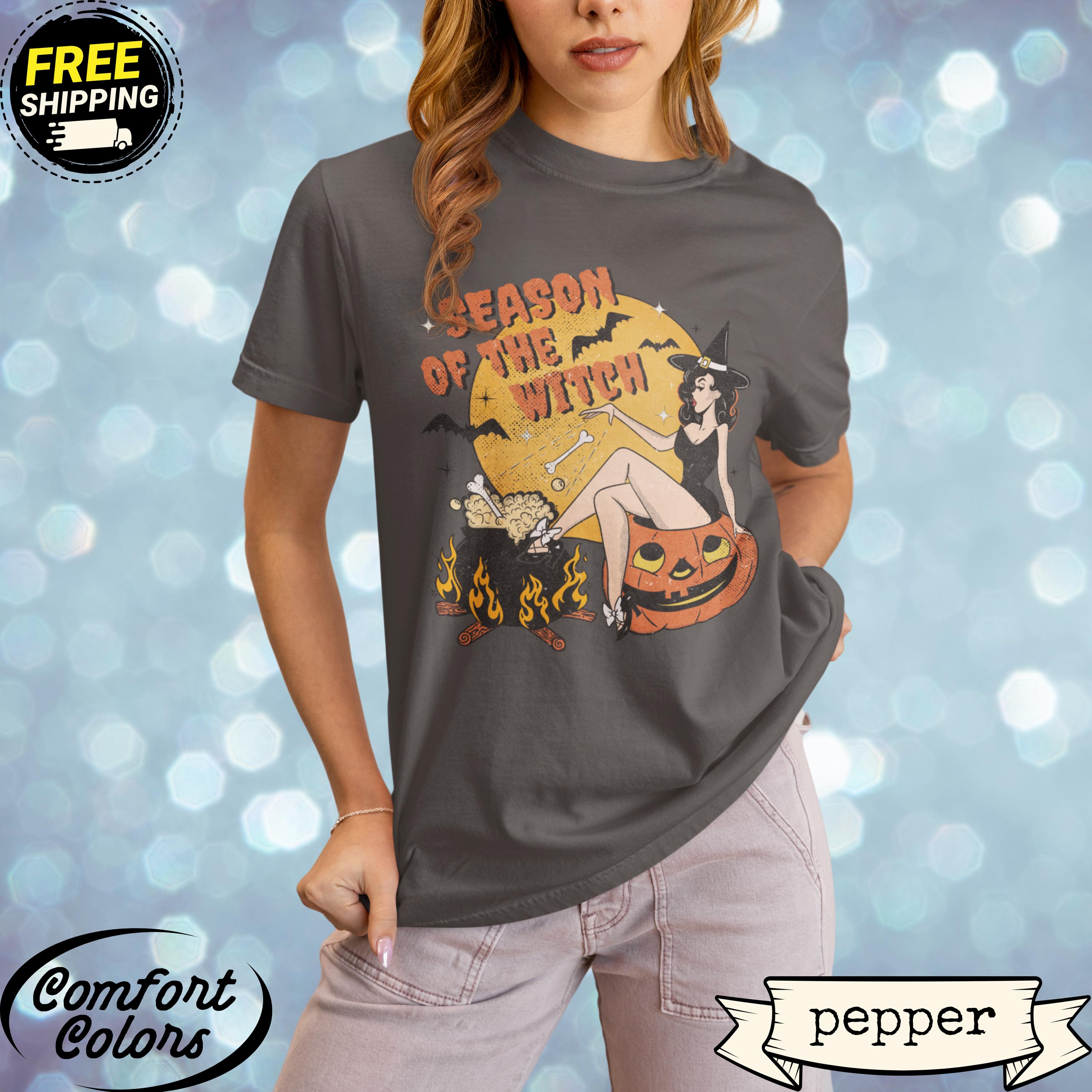 Let your spooky side strut in style with this “Season of the Witch” tee featuring a retro ivory pin-up witch perched on a pumpkin throne beneath a glowing moon. Channeling equal parts enchantment and sass, this design is perfect for fall festivals, Halloween parties, or everyday magic. The warm vintage colors and distressed comic-book style scream nostalgic charm. Printed on a premium Comfort Colors 1717 shirt, it's soft, durable, and made for mischief.