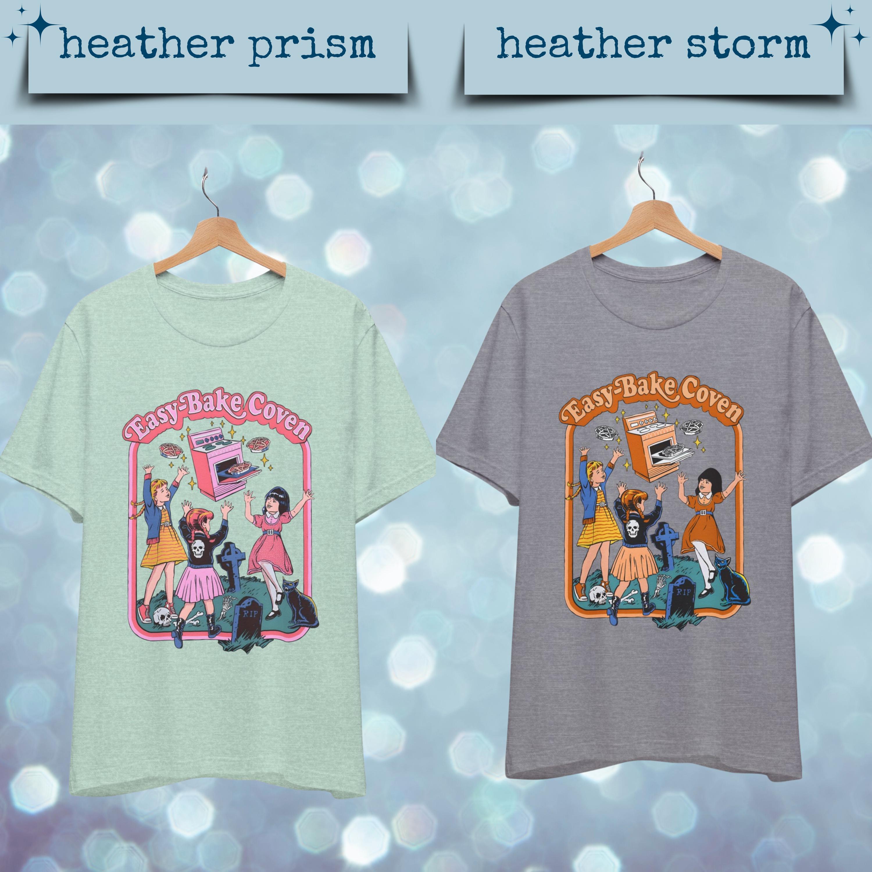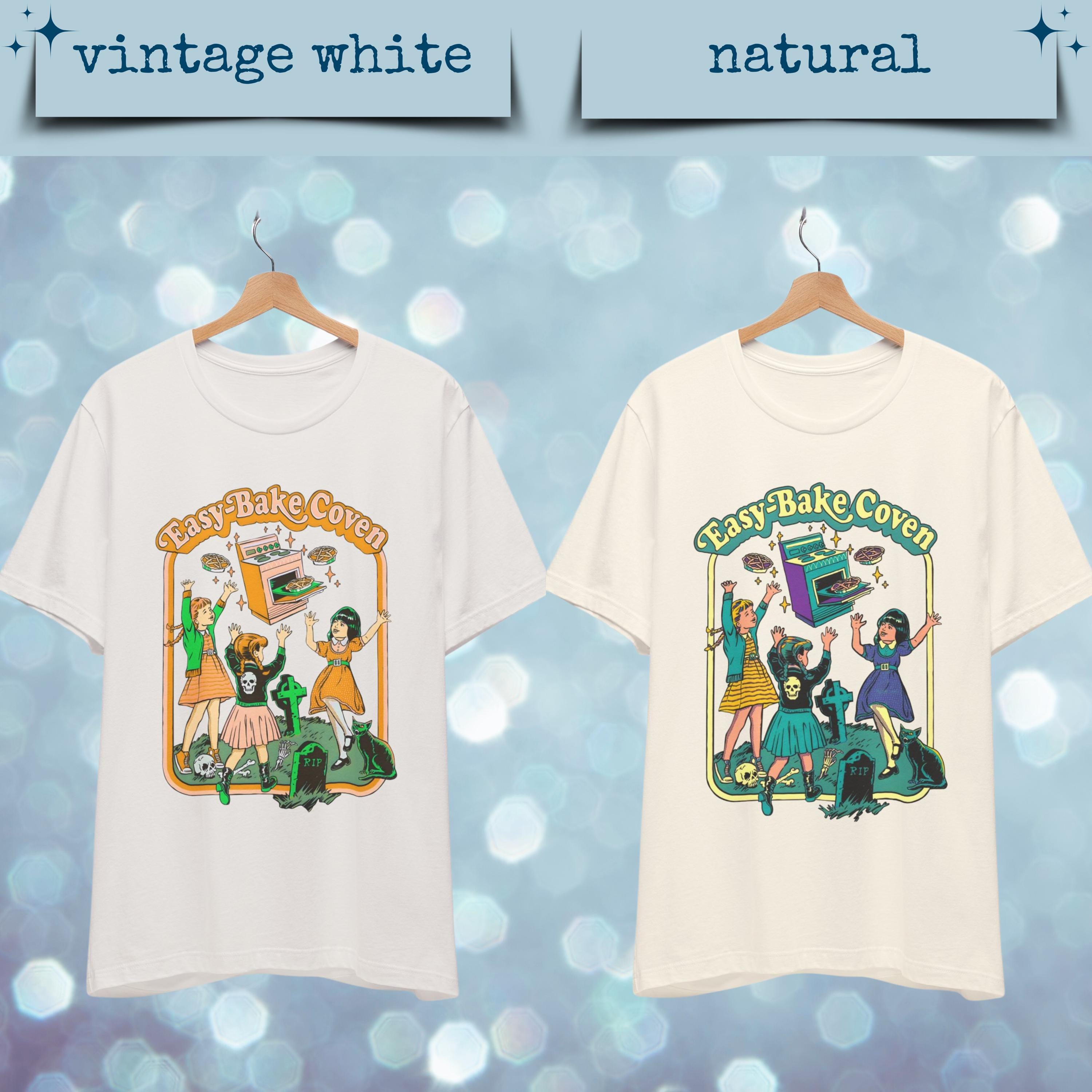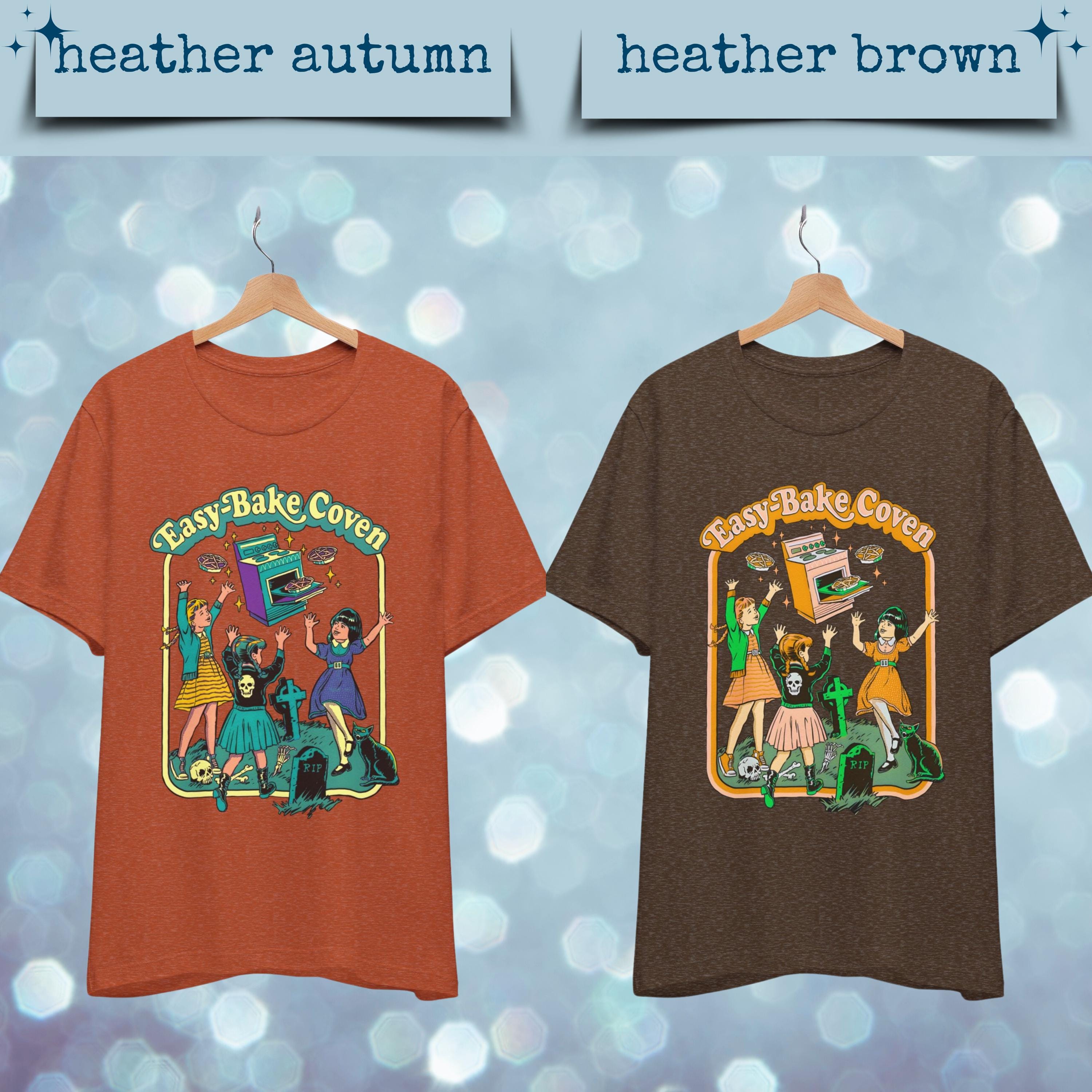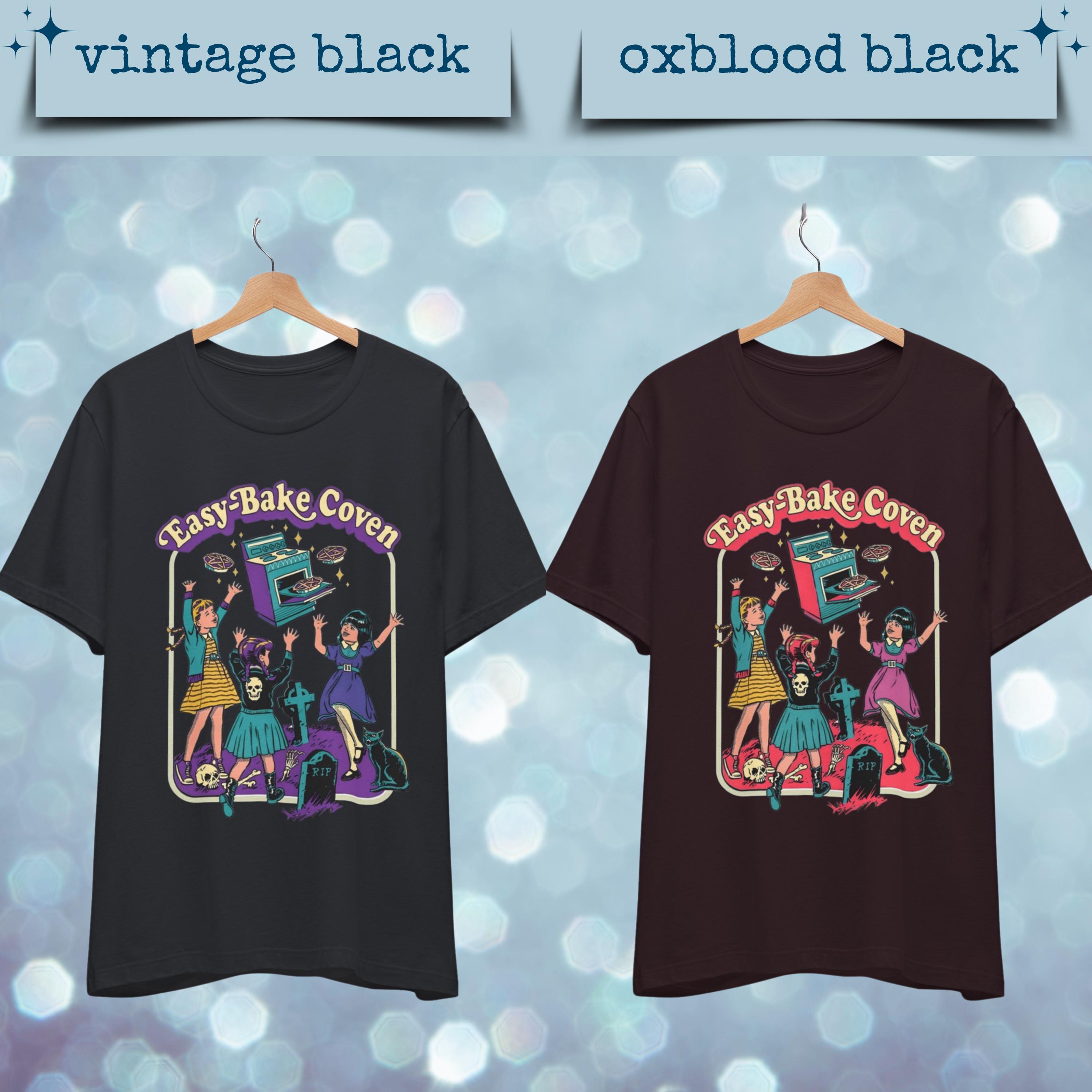 This Easy-Bake Coven T-Shirt is a funny retro witch Halloween tee with spooky baking vibes and vintage inspired flair. Perfect for Halloween parties, trick or treating, or everyday casual wear, this novelty graphic tee makes a great adult witchy costume alternative or a fun nostalgic gift. Featuring a coven of witches and a playful oven design, this retro Halloween shirt blends humor and style, making it the ultimate spooky baking shirt for witchy souls.