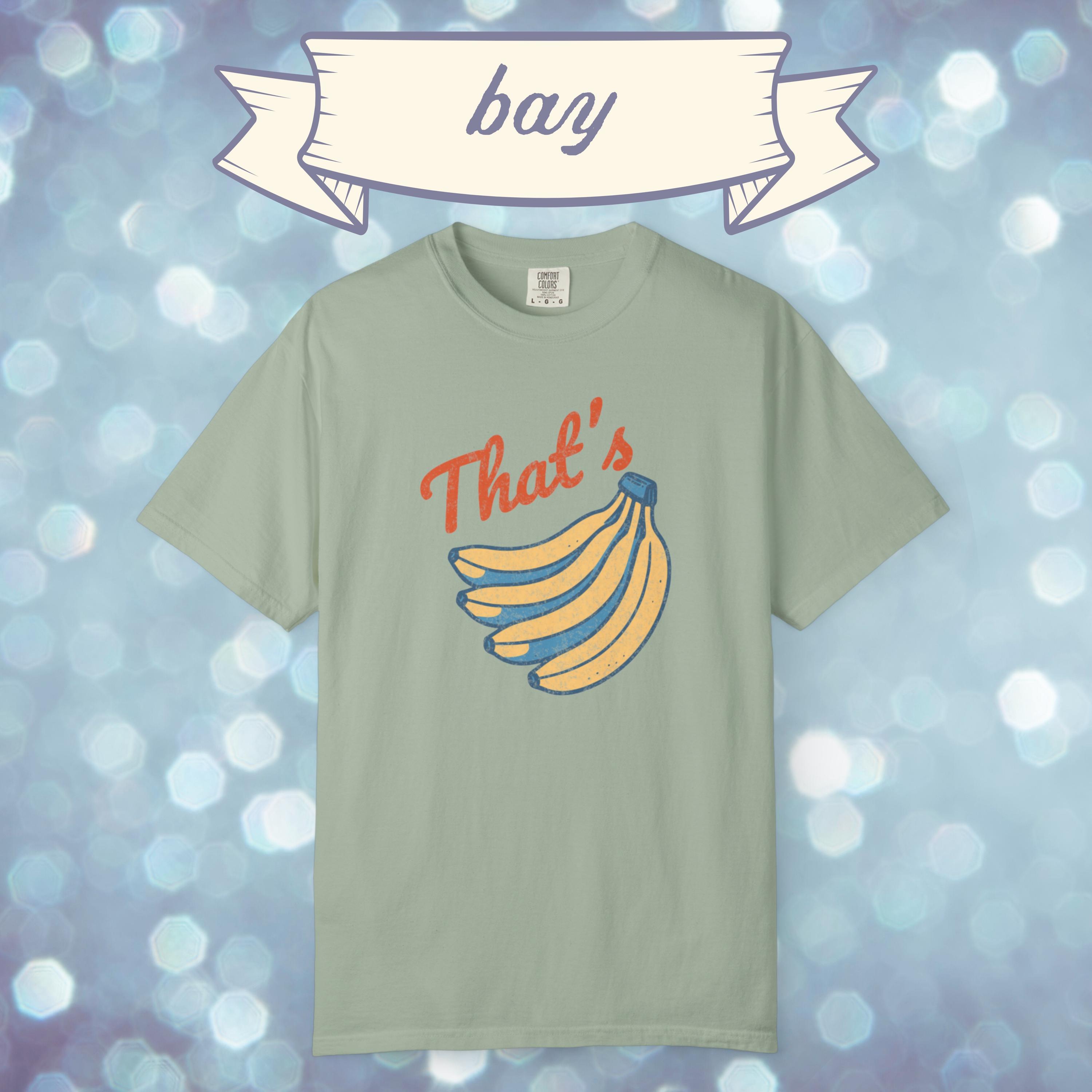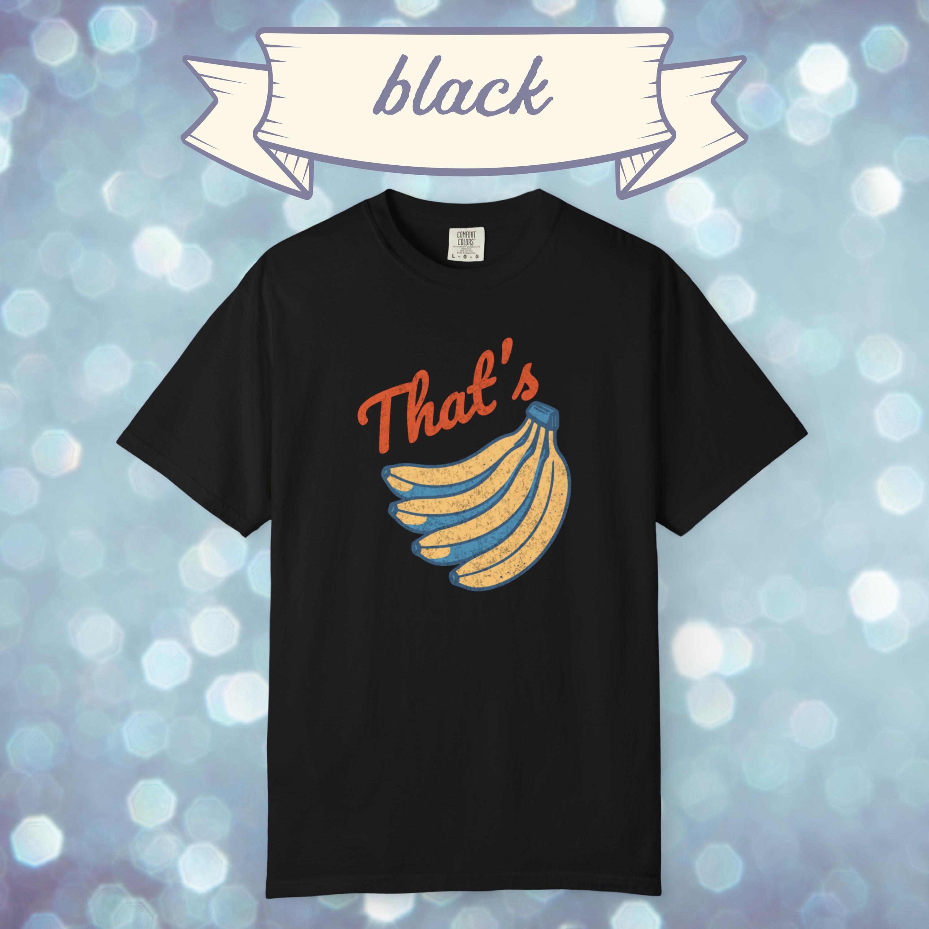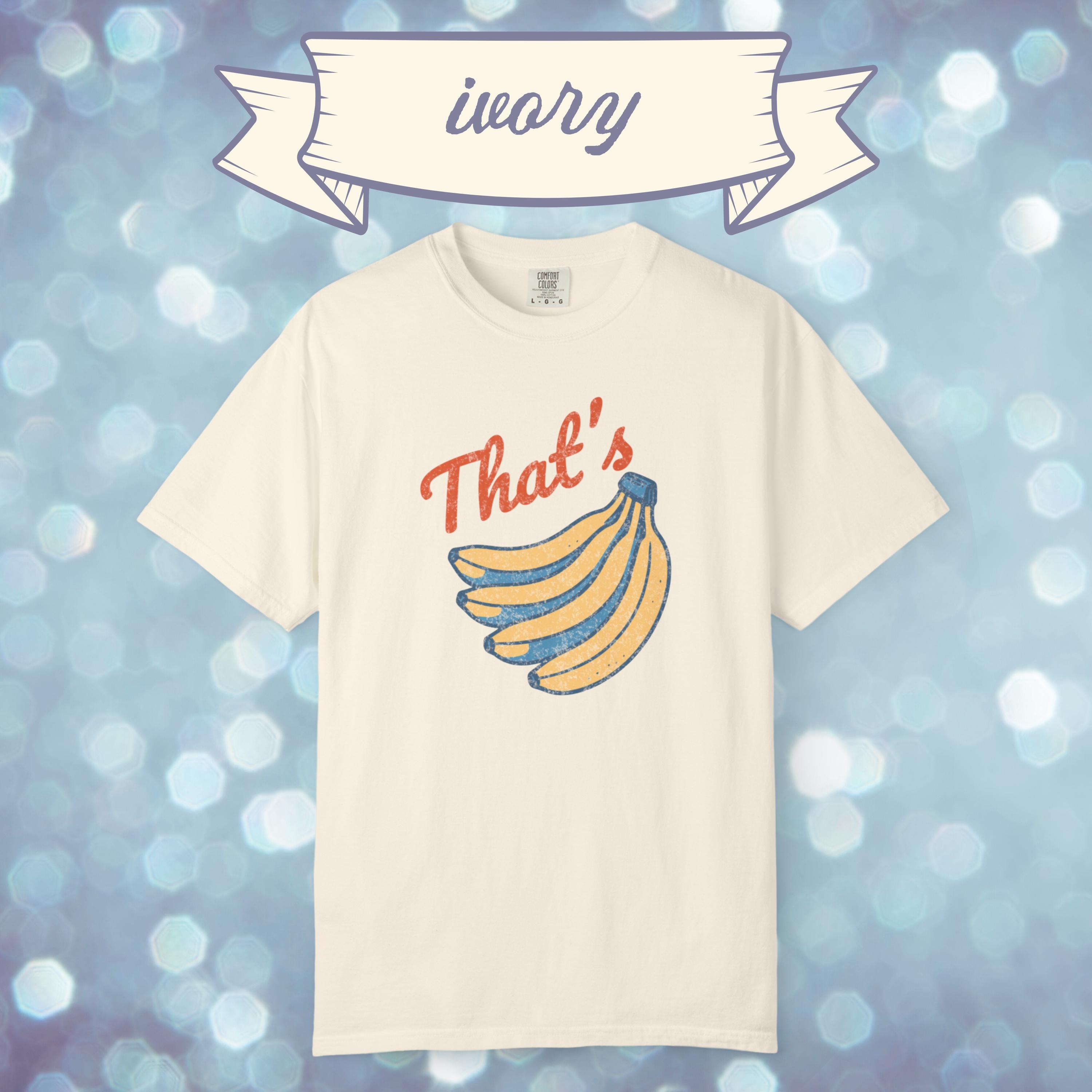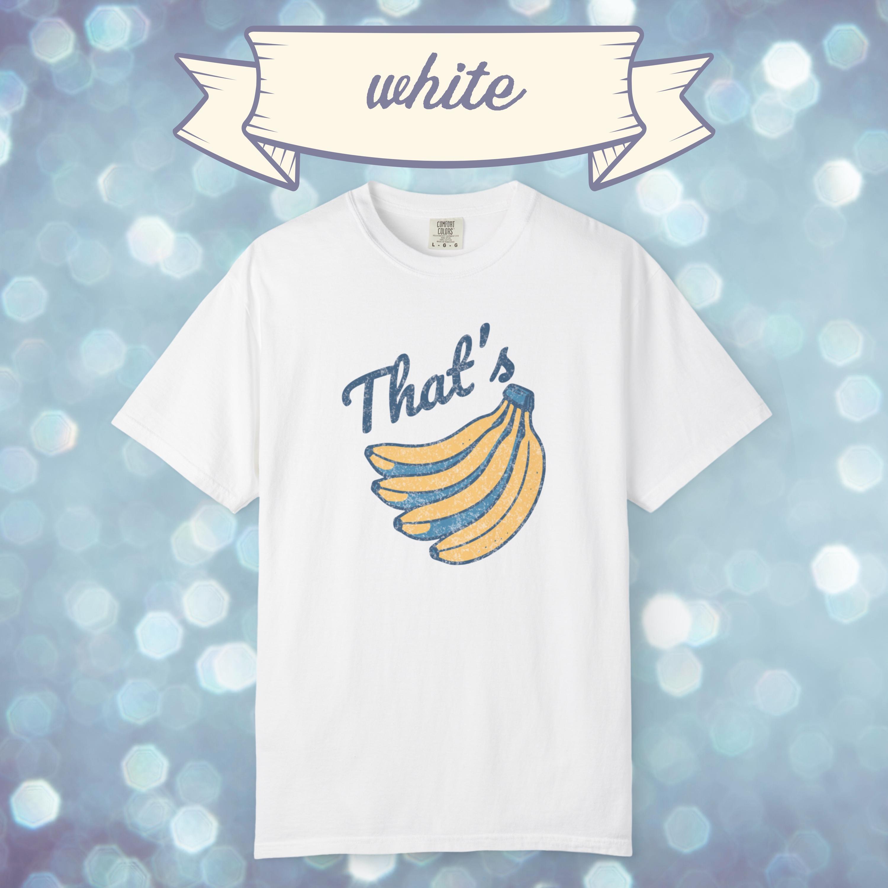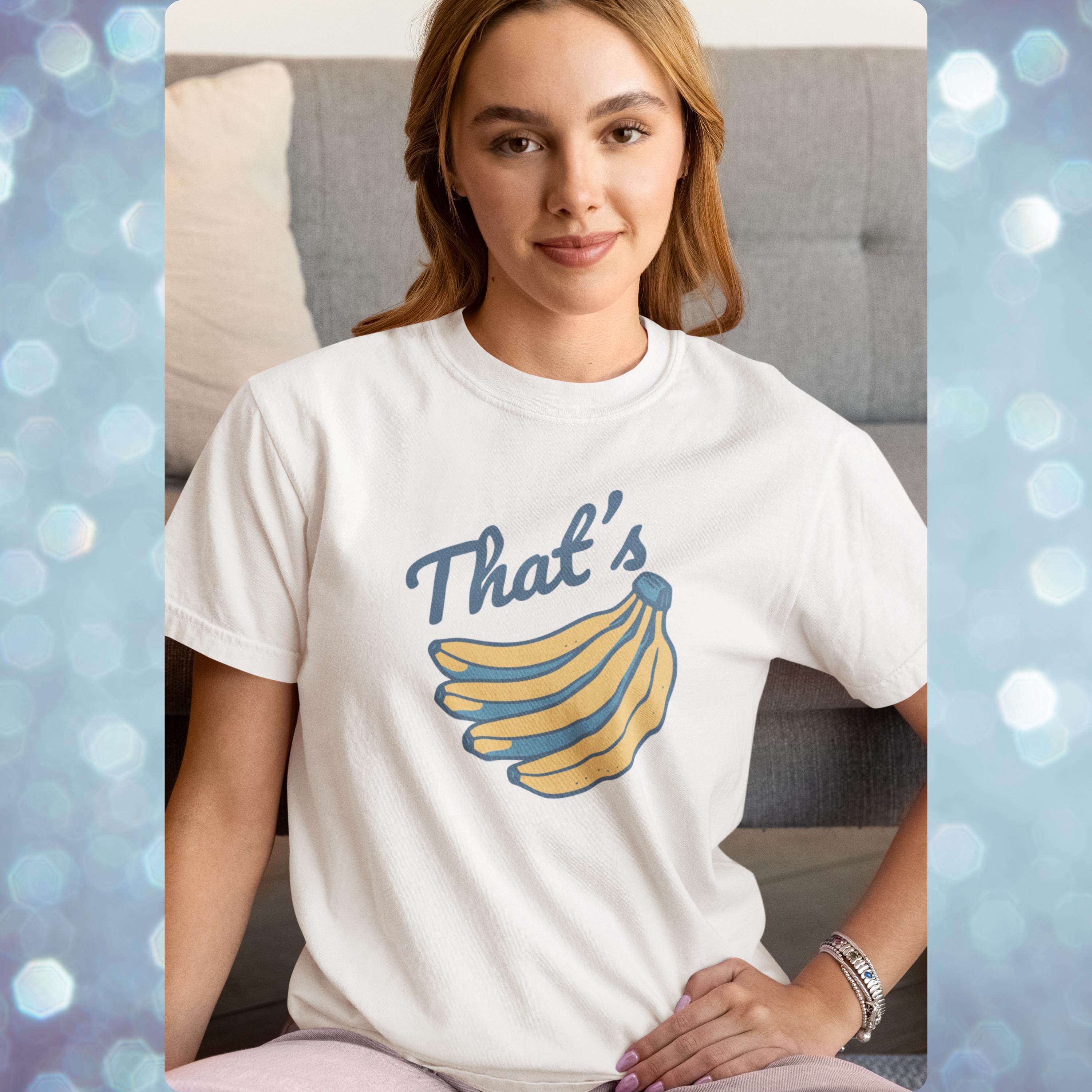 Go bananas with this retro inspired graphic tee. Featuring a vintage style banana print and bold “That’s Bananas” text, this Comfort Colors shirt blends quirky humor with a classic worn-in look. Perfect for casual outfits, festival wear, or as a novelty gift, this funny banana t shirt is soft, durable, and ready for everyday laughs. A unique graphic tee that makes a fun present for friends, fruit lovers, or anyone who enjoys a touch of retro humor.