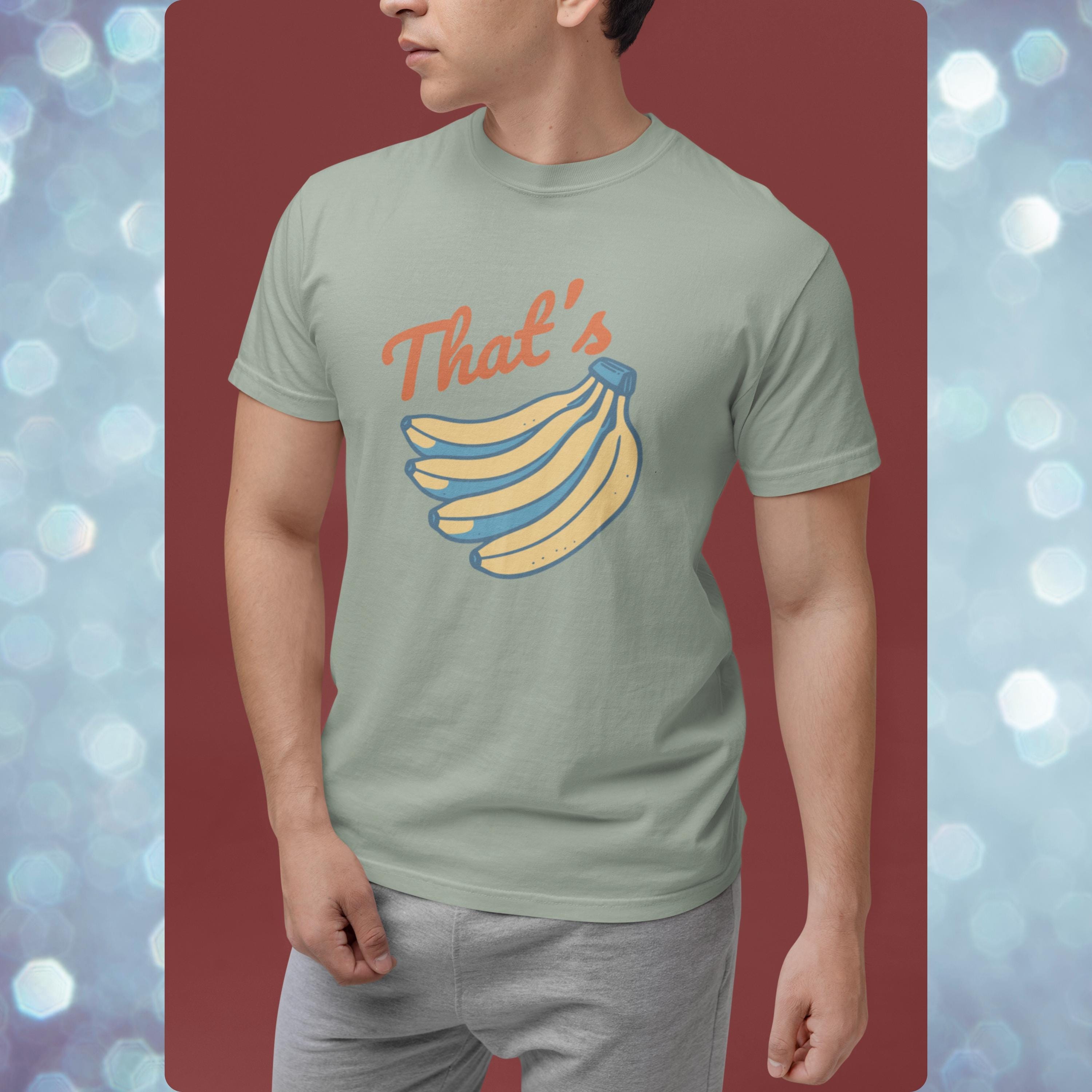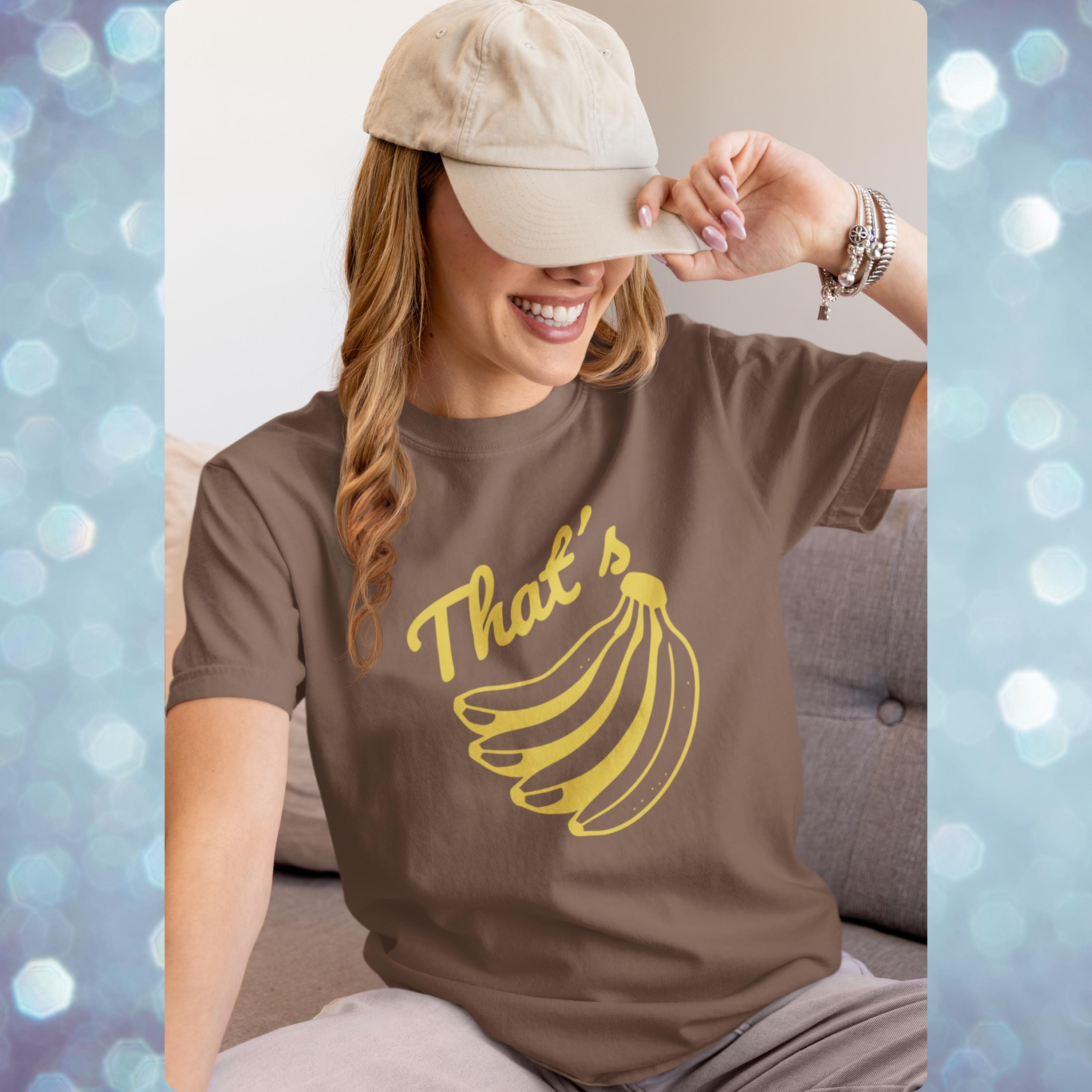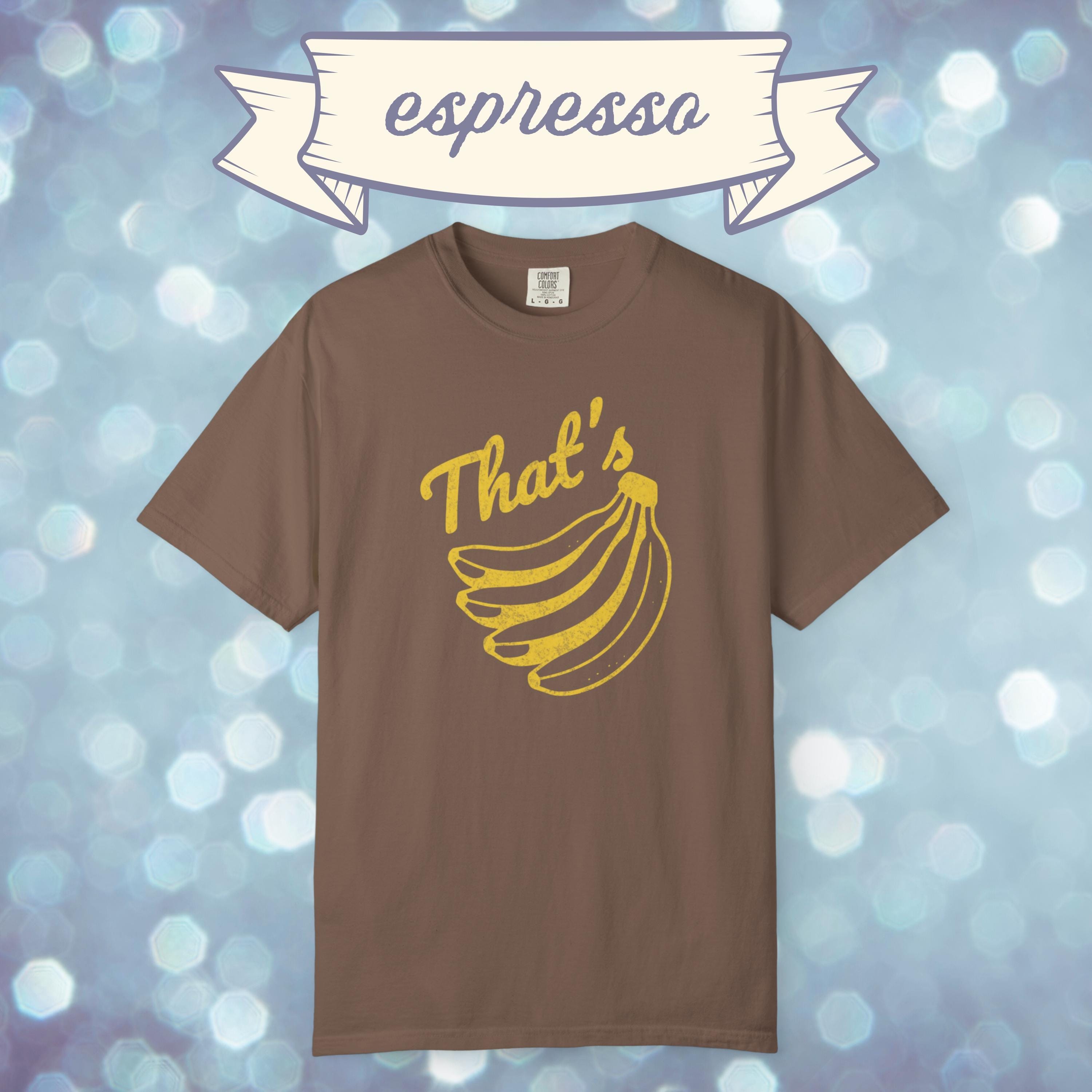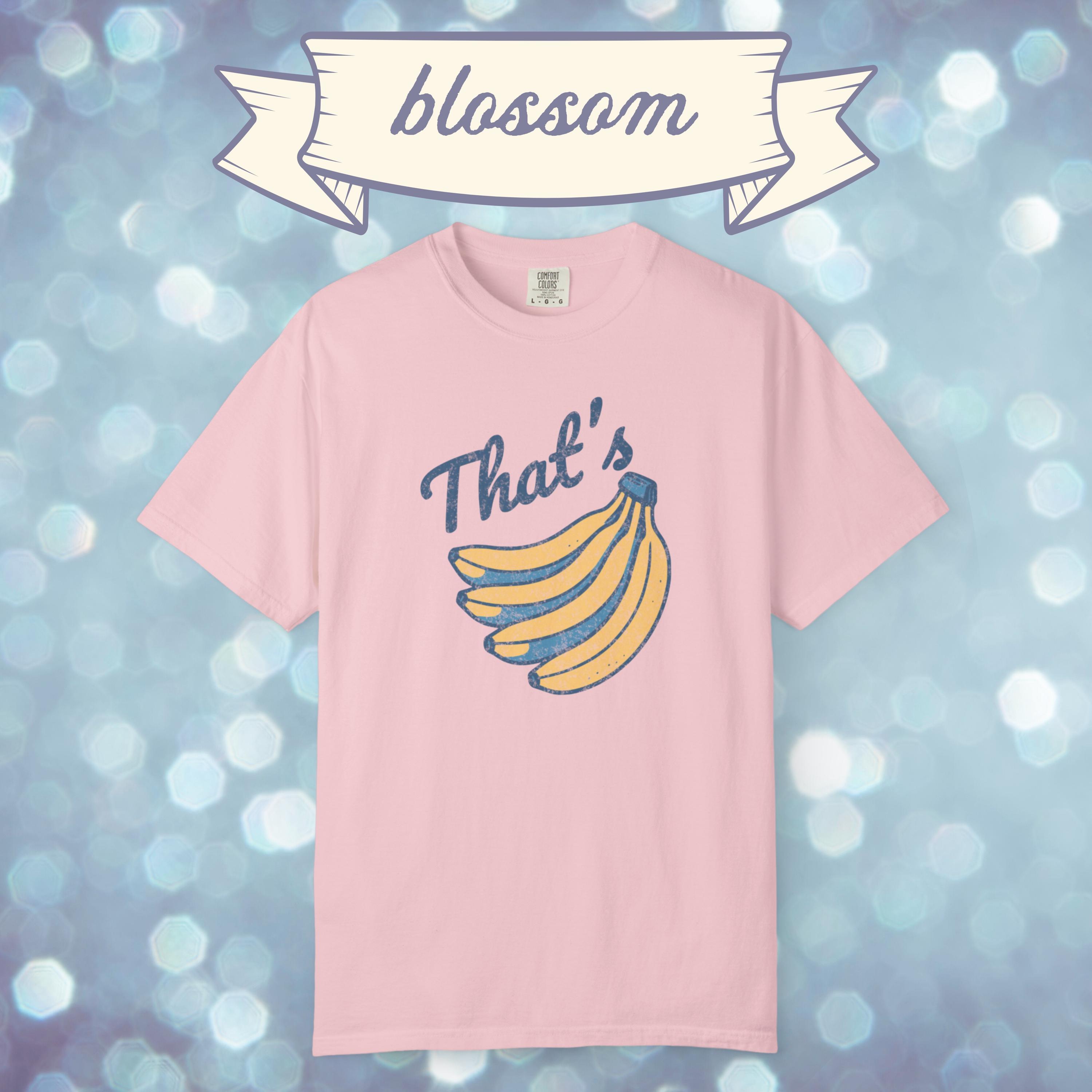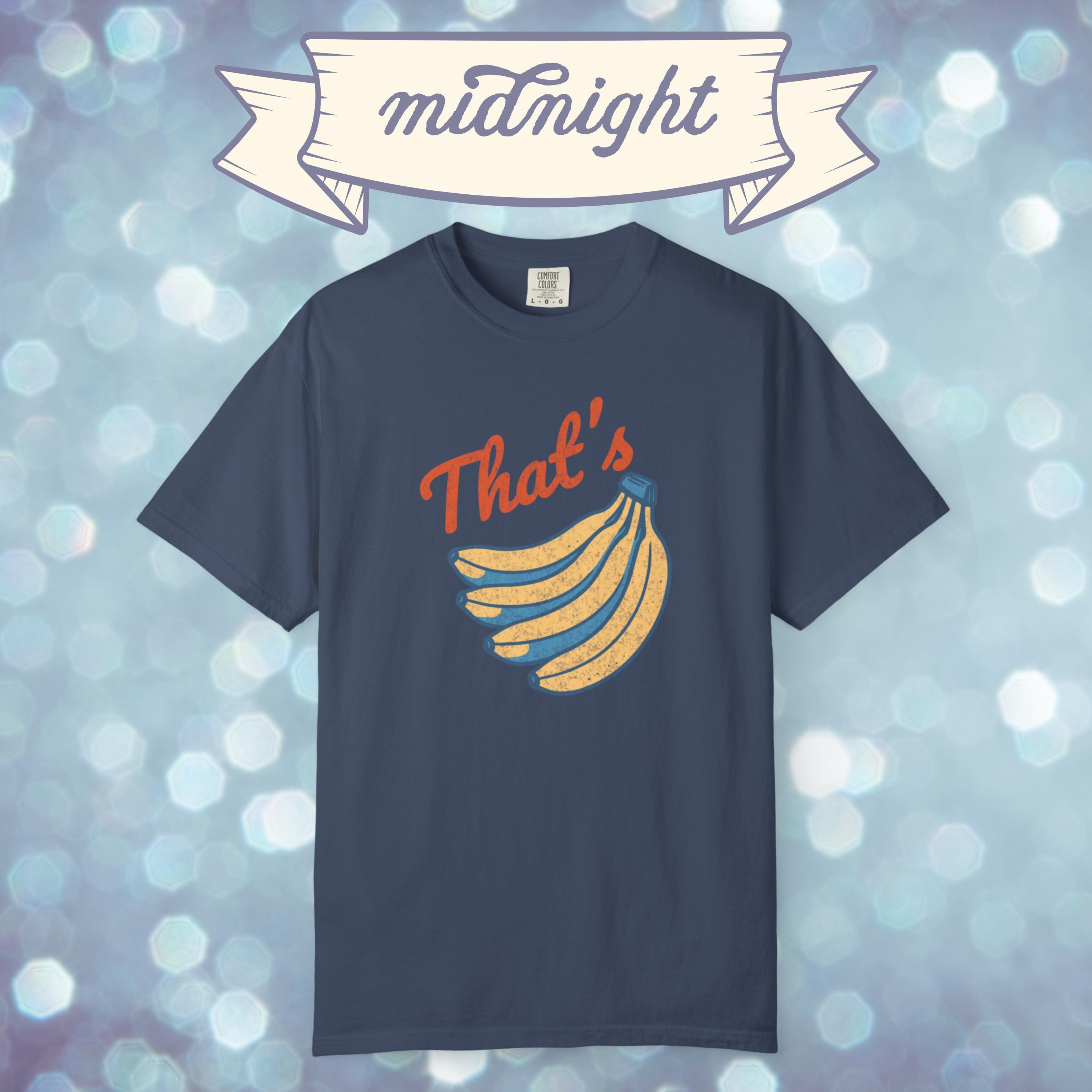 Go bananas with this retro inspired graphic tee. Featuring a vintage style banana print and bold “That’s Bananas” text, this Comfort Colors shirt blends quirky humor with a classic worn-in look. Perfect for casual outfits, festival wear, or as a novelty gift, this funny banana t shirt is soft, durable, and ready for everyday laughs. A unique graphic tee that makes a fun present for friends, fruit lovers, or anyone who enjoys a touch of retro humor.