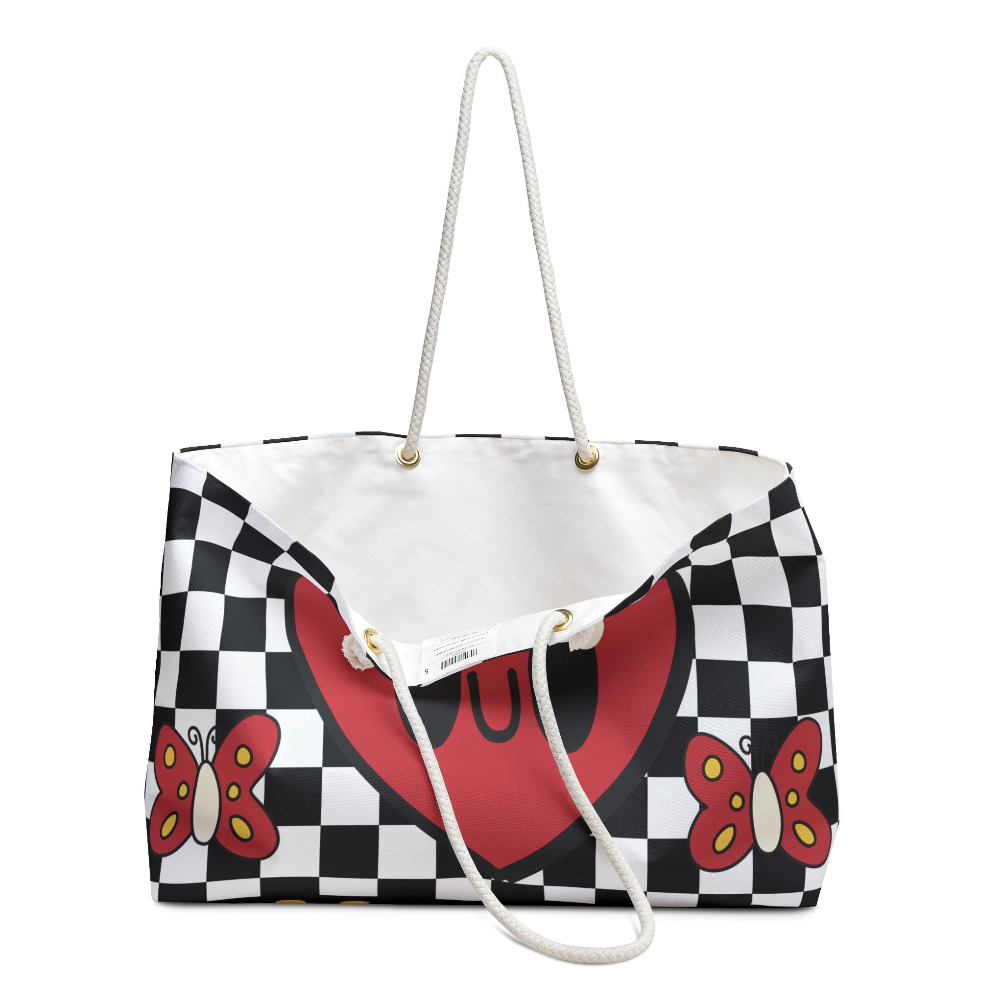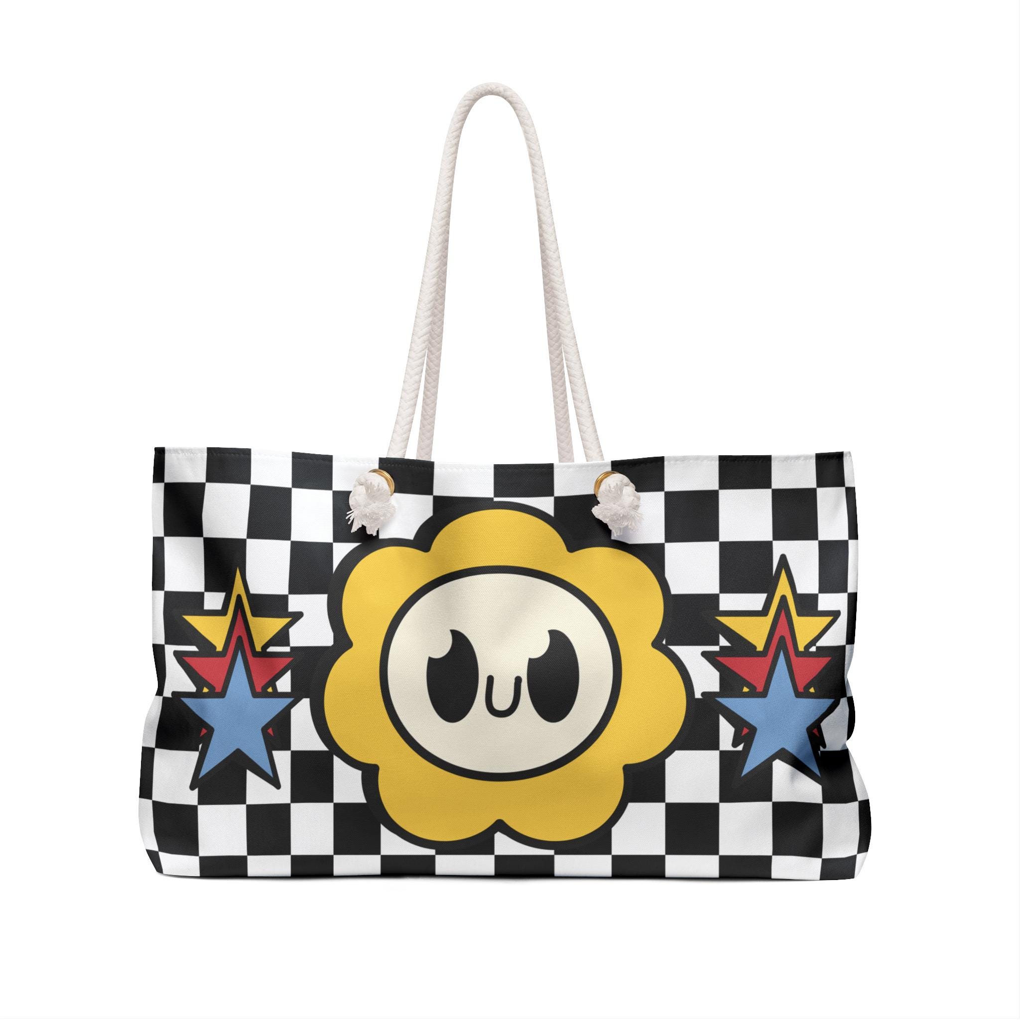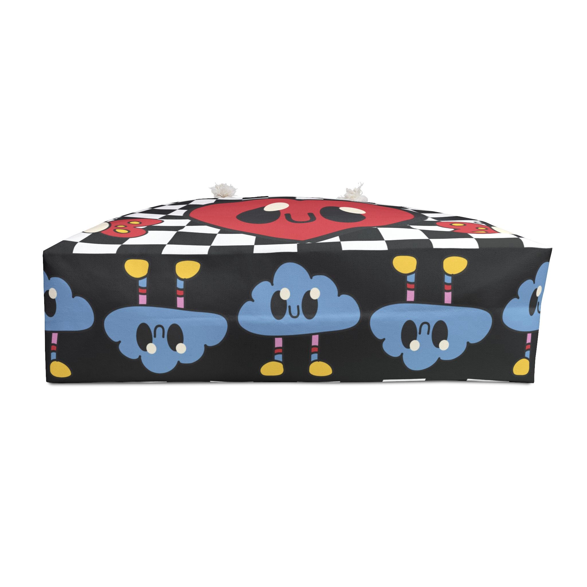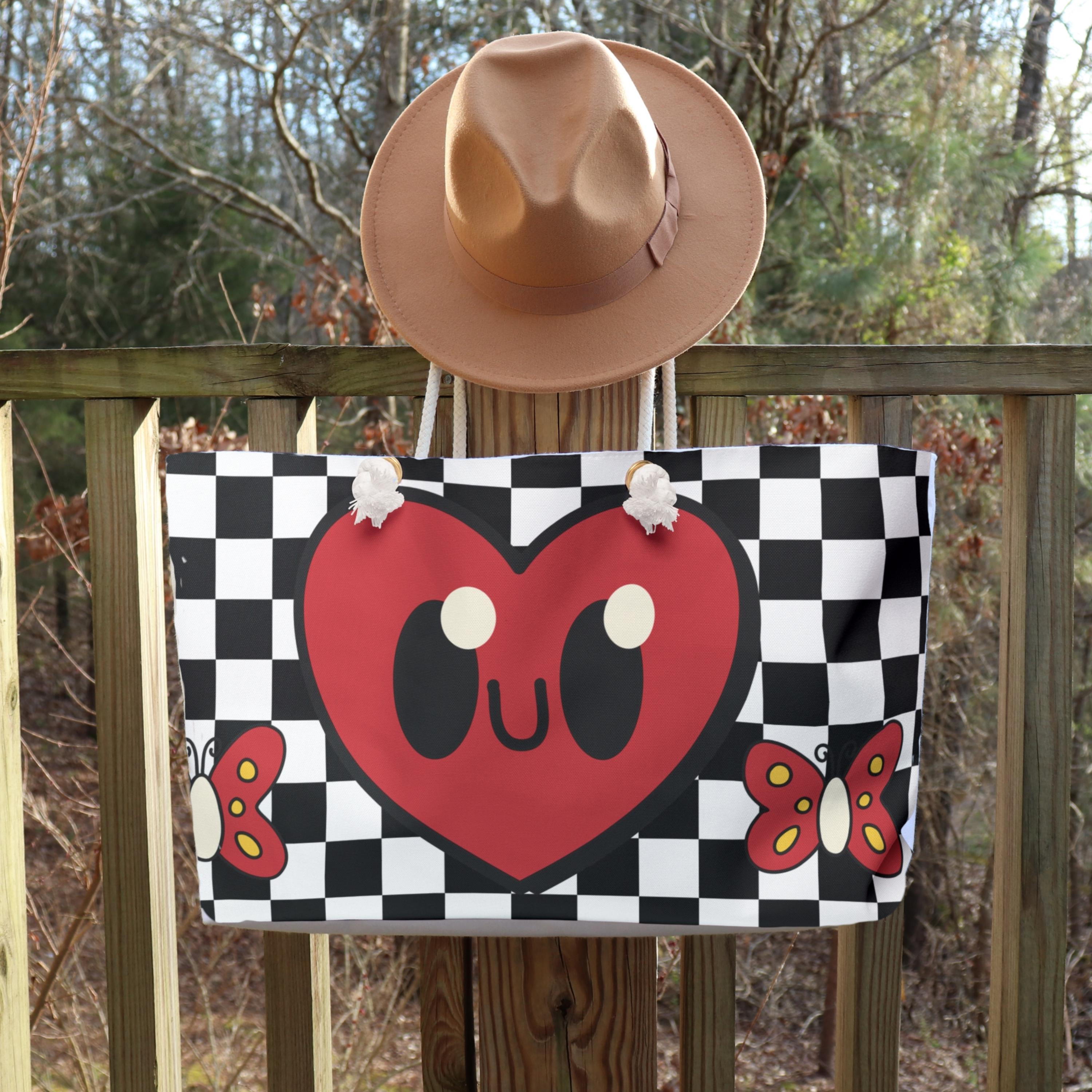 This bold checkerboard weekender bag features playful kawaii-style hearts, clouds, and flowers for a retro arcade aesthetic with modern flair. A perfect blend of nostalgic charm and vibrant personality, it's ideal for weekend trips, school hauls, or festival fashion.