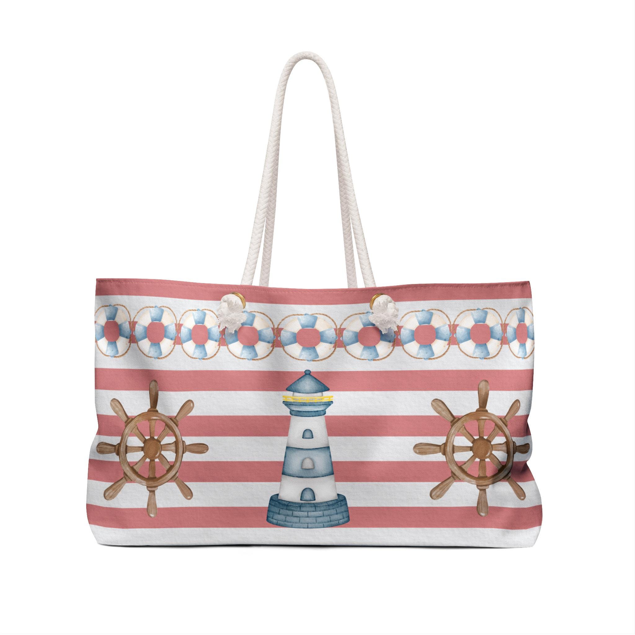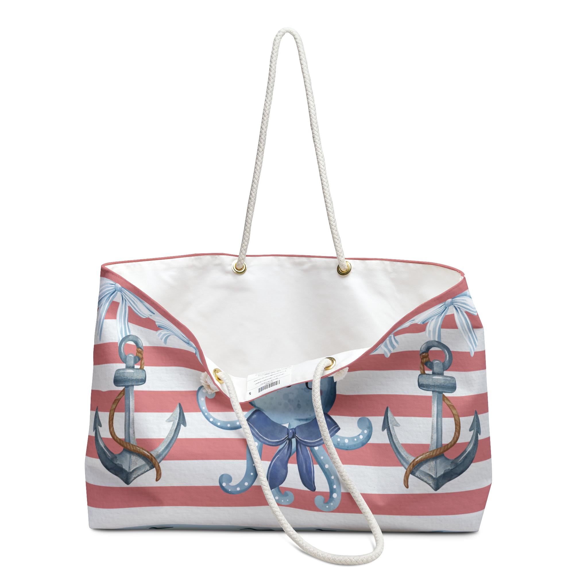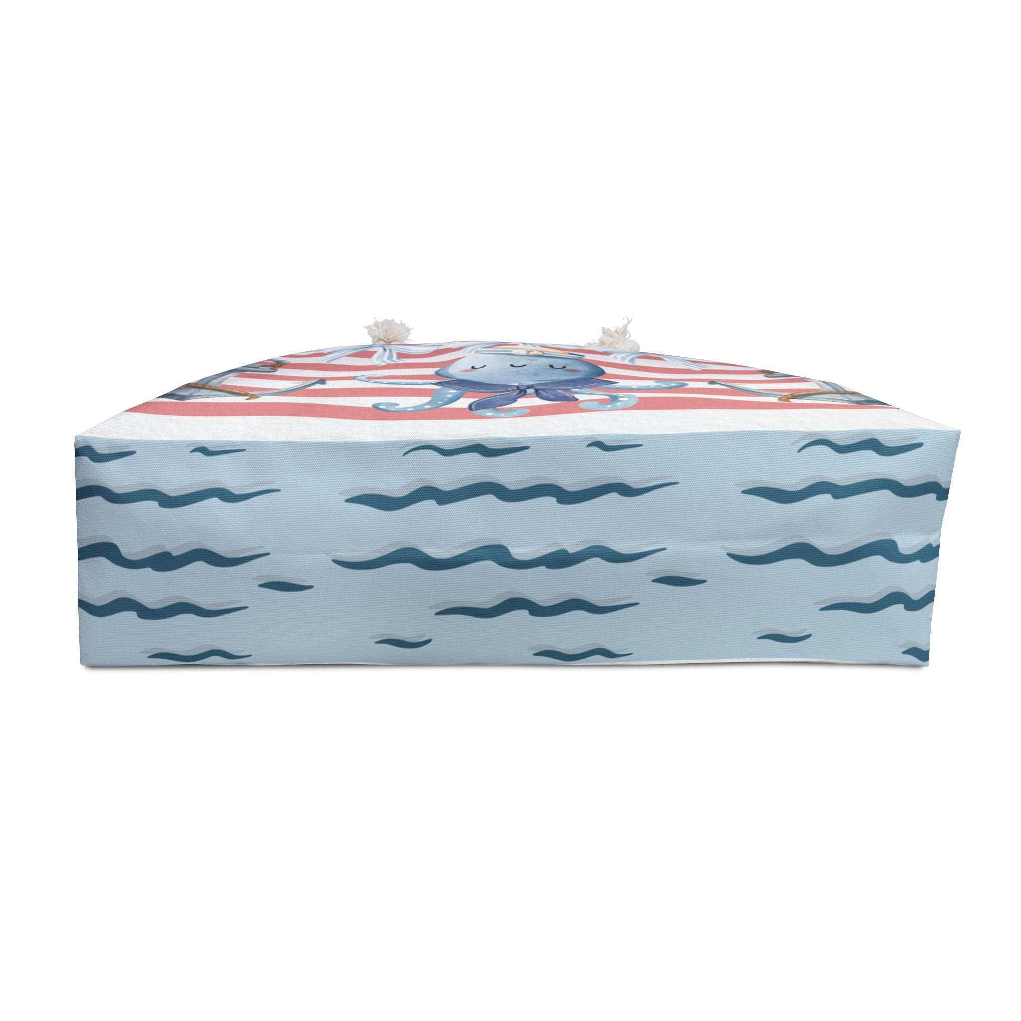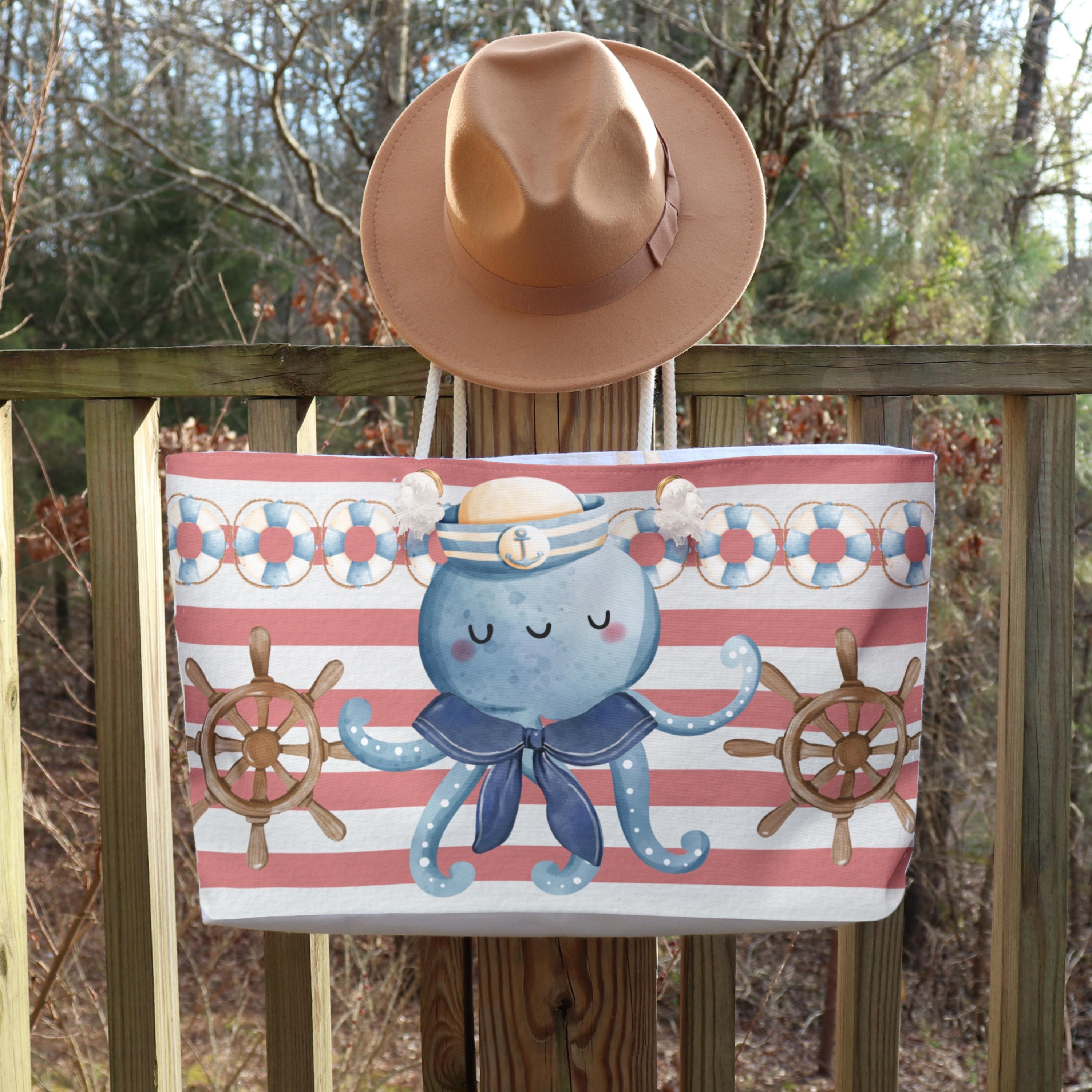 Nautical beach tote bag featuring a cute octopus, lighthouse, ship wheel, and coastal stripe design, perfect for lovers of ocean themed and preppy beach style accessories. This coastal market tote blends playful marine life, classic nautical elements, and soft pastel stripes, making it ideal for summer outings, beach trips, everyday errands, or a fun gift for ocean lovers and seaside aesthetic fans.