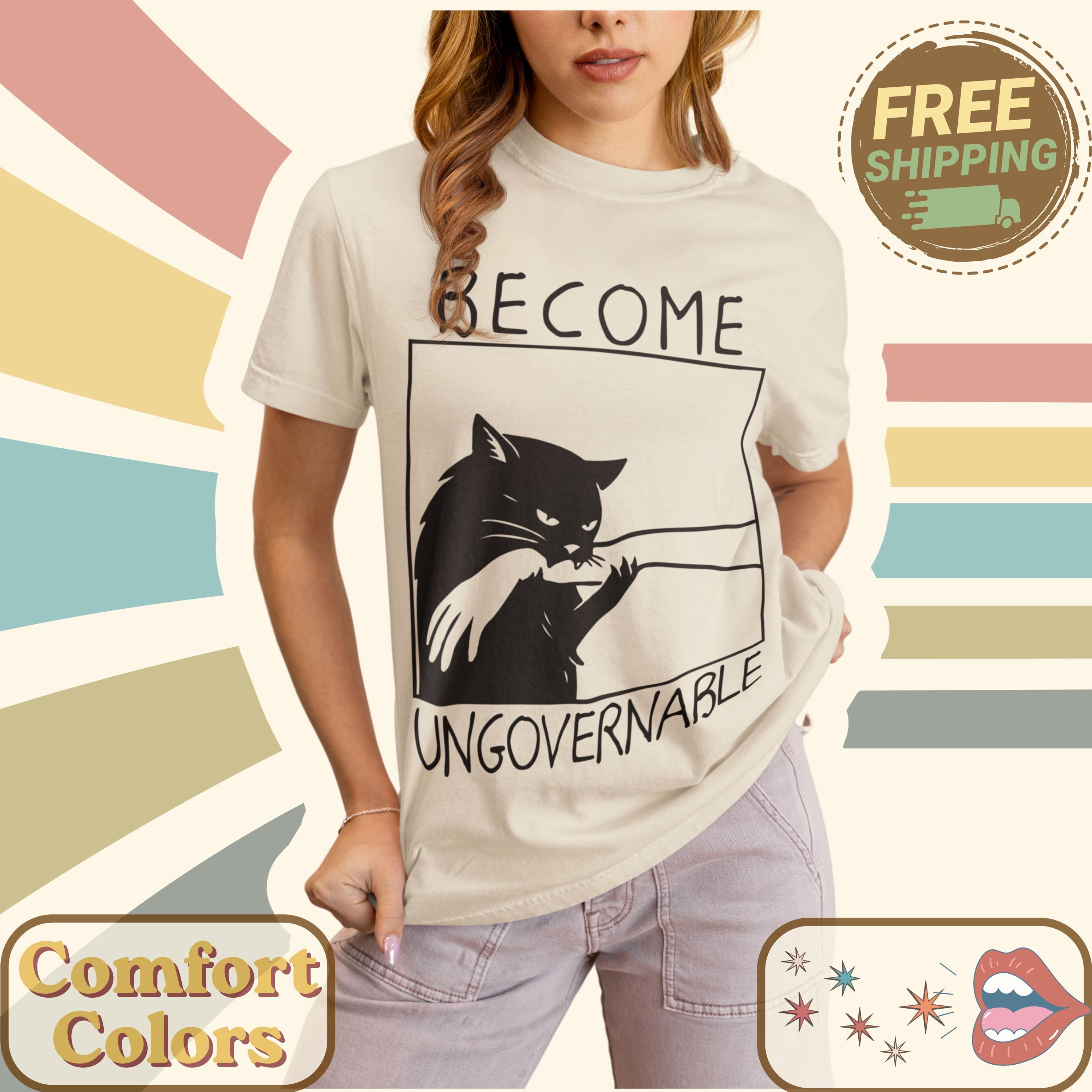 Become Ungovernable gothic cat shirt with black cat graphic and alternative aesthetic style. This edgy grunge graphic tee blends dark humor with rebellious energy for goth, emo, and alt streetwear lovers. Featuring a sarcastic biting cat design, this punk inspired shirt is perfect for anti social moods, witchy vibes, and anyone who prefers chaos over control. Soft casual wear shirt ideal for everyday outfits, concerts, or making a statement without saying a word.